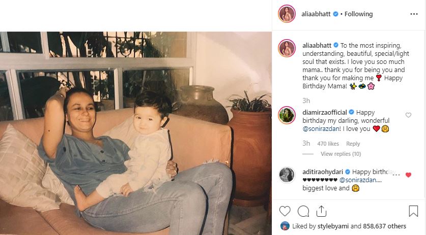 'Rehna Hai Tere Dil Mein' actor Dia Mirza wished her with a comment that read, "Happy birthday my darling, wonderful @sonirazdan! I love you [?]"