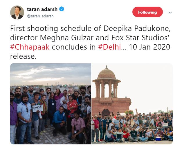 “First shooting schedule of Deepika Padukone, director Meghna Gulzar, and Fox Star Studios' #Chhapaak concludes in #Delhi... 10 Jan 2020 release,” he tweeted.