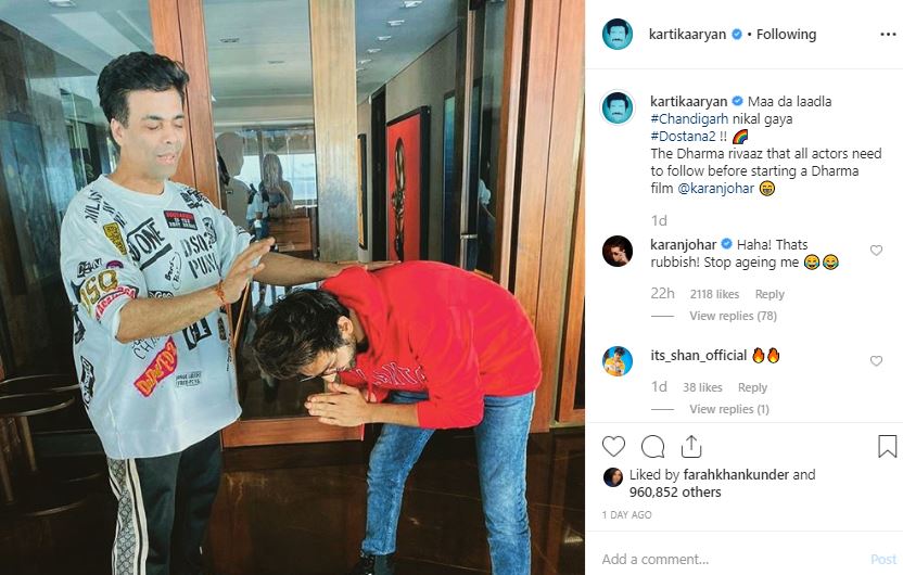 Before commencing the shoot of his much-awaited film, the 'Luka Chuppi' actor shared a post on the photo-sharing application where he can be seen seeking blessings from Karan Johar. The ace director can be seen blessing him with good luck.
