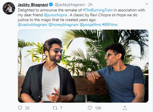 Jackky took to Twitter to share the news of the remake and tweeted, "Delighted to announce the remake of #TheBurningTrain in association with my dear friend @junochopra. A classic by Ravi Chopra sir. Hope we do justice to the magic that he created years ago. @vashubhagnani @honeybhagnani @poojafilms #BRFilms."