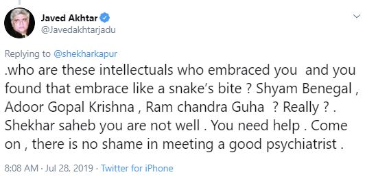 "Who are these intellectuals who embraced you and you found that embrace like a snake's bite ? Shyam Benegal , Adoor Gopal Krishna , Ram chandra Guha ? Really ?. Shekhar saheb you are not well . You need help . Come on , there is no shame in meeting a good psychiatrist," read the reply from Javed.