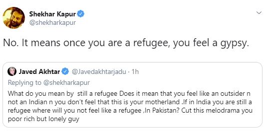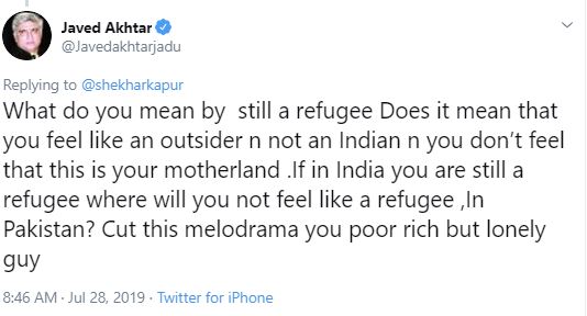 Javed asked Shekhar if he would not feel a refugee in Pakistan? Further calling him "poor rich but lonely guy", the 74 year old wrote, "If in India you are still a refugee where will you not feel like a refugee, In Pakistan? Cut this melodrama you poor rich but lonely guy."