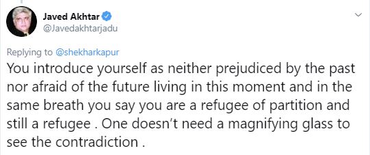 "You introduce yourself as neither prejudiced by the past nor afraid of the future living in this moment and in the same breath you say you are a refugee of partition and still a refugee. One doesn't need a magnifying glass to see the contradiction," he tweeted.