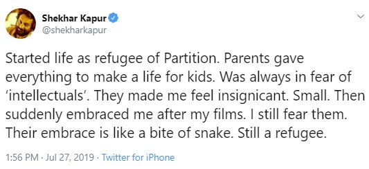 "Started life as refugee of Partition. Parents gave everything to make a life for kids. Was always in fear of 'intellectuals'. They made me feel insignicant. Small," read the tweet.