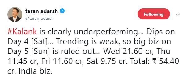 He wrote, “#Kalank is clearly underperforming... Dips on Day 4 [Sat]... Trending is weak, so big biz on Day 5 [Sun] is ruled out... Wed 21.60 cr, Thu 11.45 cr, Fri 11.60 cr, Sat 9.75 cr. Total: ₹ 54.40 cr. India biz.”