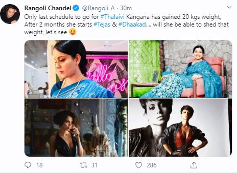 Kangana gained 20 kgs weight during 'Thalaivi' shoot, says Rangoli Chandel