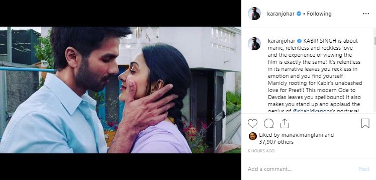 "KABIR SINGH is about manic, relentless and reckless love and the experience of viewing the film is exactly the same! It's relentless in its narrative leaves you reckless in emotion and you find yourself Manicly rooting for Kabir's unabashed love for Preeti!" Karan's post read.