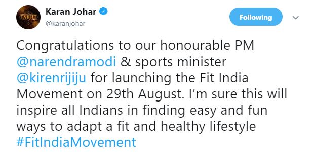 In a congratulatory tweet, Karan Johar tweeted, "Congratulations to our honourable PM Narendra Modi and sports minister Kiren Rijiju for launching the Fit India Movement on 29th August. I'm sure this will inspire all Indians in finding easy and fun ways to adapt a fit and healthy lifestyle #FitIndiaMovement."