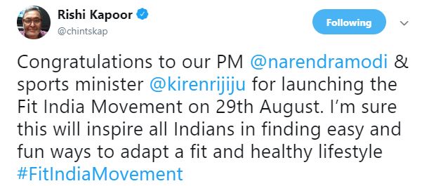 Echoing similar sentiments, Rishi Kapoor, who is currently undergoing treatment in New York, said, "Congratulations to our PM Narendra Modi and sports minister Kiren Rijiju for launching the Fit India Movement on 29th August. I'm sure this will inspire all Indians in finding easy and fun ways to adapt a fit and healthy lifestyle #FitIndiaMovement."