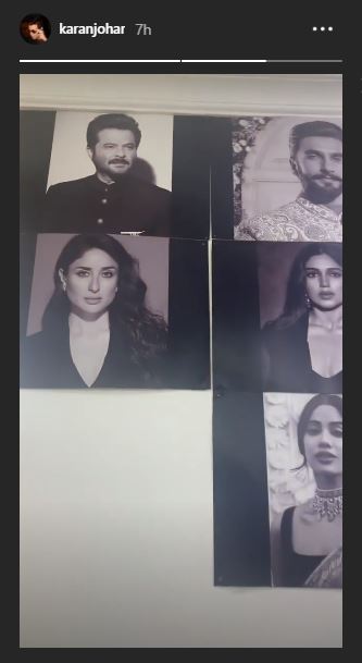 The clip shows black and white pictures of the star cast of the film including Anil Kapoor, Kareena Kapoor, Bhumi Pednekar, Vicky Kaushal, Alia Bhatt, Janhvi Kapoor and Ranveer Singh pinned on a wall.