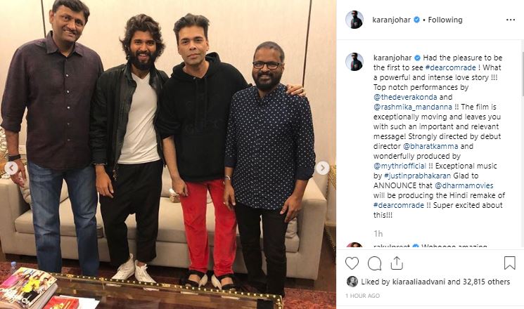 "Had the pleasure to be the first to see #dearcomrade ! What a powerful and intense love story !!! Top notch performances by @thedeverakonda and @rashmika_mandanna !! The film is exceptionally moving and leaves you with such an important and relevant message! Strongly directed by debut director @bharatkamma and wonderfully produced by @mythriofficial !! Exceptional music by #justinprabhakaran Glad to ANNOUNCE that @dharmamovies will be producing the Hindi remake of #dearcomrade !! Super excited about this!!!," he wrote on Instagram.