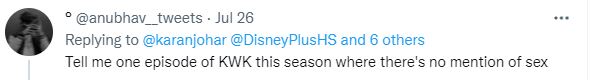 "Tell me one episode of KWK this season where there's no mention of sex," user stated.