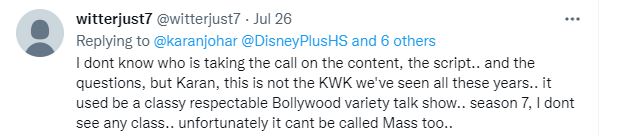 One user wrote, "I don't know who is taking the call on the content, the script.. and the questions, but Karan, this is not the KWK we've seen all these years.. it used be a classy respectable Bollywood variety talk show.. season 7, I dont see any class.. unfortunately it cant be called Mass too."