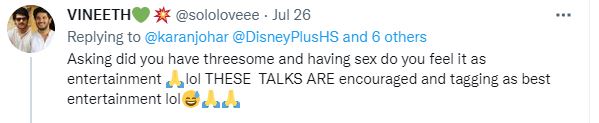 Another comment stated, "Hey Karan, you are pushing the envelop in many ways. It's about to tear. Amazed at what is being talked about on "national OTT" in the name of entertainment and TRP."