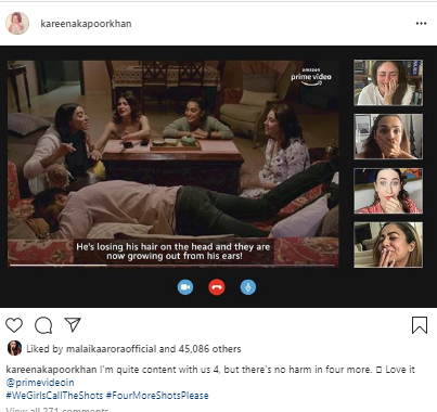 "I'm quite content with us 4, but there's no harm in four more. Love it @primevideoin #WeGirlsCallTheShots #FourMoreShotsPlease," Kareena captioned the post.