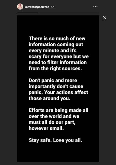 "Don't panic and more importantly don't cause panic. Your actions affect those around you. Efforts are being made all over the world and we must all do our part, however small. Stay safe. Love you all," Kareena added.