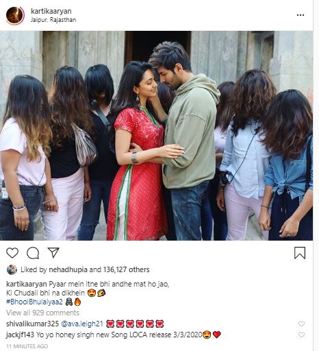 The 'Love Aaj Kal' actor shared a picture on Instagram where he is seen romancing Kiara Advani amid a couple of girls who act like witches by covering their faces with open hair. He captioned the post as, "Pyaar mein itne bhi andhe mat ho jao,Ki Chudail bhi na dikhein #BhoolBhulaiyaa2" (along with scary emojis).