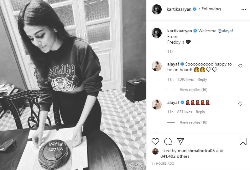 "Welcome @alayaf From Freddy :)," Kartik wrote in the caption with a monochrome picture featuring Alaya cutting a cake on the film sets.