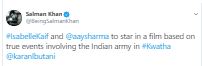 "#IsabelleKaif and Aayush Sharma to star in a film based on true events involving the Indian army in #Kwatha Karan Lalit Butani," he tweeted.