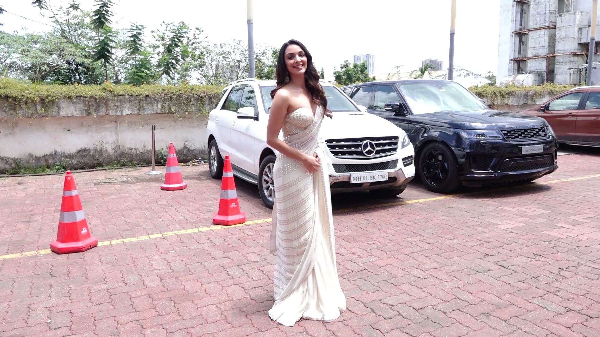 Kiara was seen wearing a white Saree with sequin embroidery over it. She wore a corset-inspired tube blouse and completed the look by pairing the saree with gold and green 'jhumkas'.