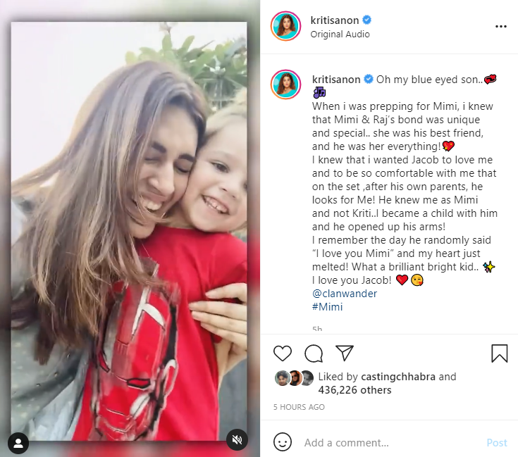 "Oh, my blue-eyed son...When I was prepping for Mimi, I knew that Mimi & Raj's bond was unique and special.. she was his best friend, and he was her everything!" Kriti captioned the post.