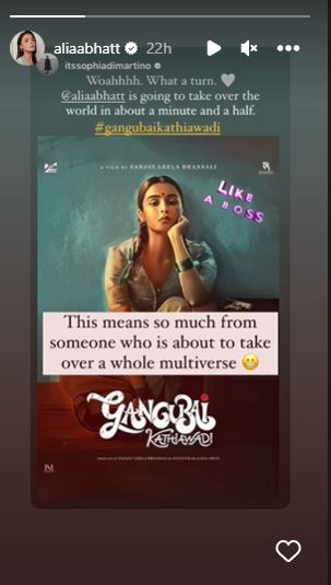 "Woahhh. What a turn @aliabhatt is going to take over the world in about a minute and a half #GangubaiKathiawadi" Martino wrote alongside the film's poster.