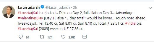 Film critic and trade analyst Taran Adarsh shared the figures on Twitter and wrote,"#LoveAajKal is rejected... Dips on Day 2, falls flat on Day 3... Advantage #ValentinesDay [Day 1], else *3-day total* would be lower... Tough road ahead [weekdays]... Fri 12.40 cr, Sat 8.01 cr, Sun 8.10 cr. Total: Rs 28.51 cr. #India biz. #LoveAajKal [2009] weekend: Rs 27.86 cr."