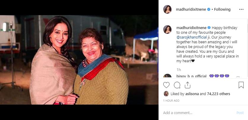 The 52-year-old actor shared a picture with Saroj Khan, on Instagram with a message that read," Happy birthday to one of my favorite people @sarojkhanofficial ji. Our journey together has been amazing and I will always be proud of the legacy you have created. You are my Guru and will always hold a very special place in my heart."