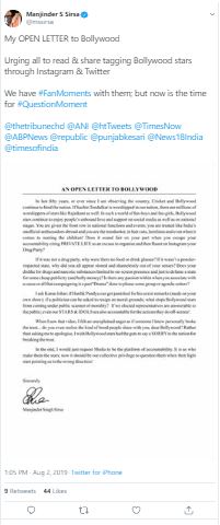 "You are given the front row in national functions and events; you are treated like India's unofficial ambassadors abroad and you are the trendsetter, in haircuts, hemlines and even when it comes to naming the children! Does it sound fair on your part when you escape your accountability citing PRIVATE LIFE as an excuse to organise and then flaunt on Instagram your Drug Party?" read the letter shared by Sirsa on Twitter.