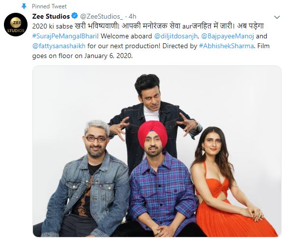 The production house took to Twitter to announce the forthcoming project in a post that read, " Welcome aboard @diljitdosanjh, @BajpayeeManoj and @fattysanashaikh for our next production! Directed by #AbhishekSharma. Film goes on floor on January 6, 2020.