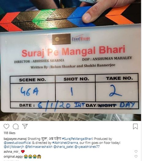 The 50-year-old actor took to Instagram as he shared a picture of the shooting clapboard, along with a caption that reads, " Shooting, ab Hoga #SurajPeMangalBhari! Produced by @zeestudiosofficial & directed by #AbhishekSharma, our film goes on the floor today!"
