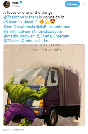 "A tease of one of the things @TheJohnAbraham is gonna do in #SatyamevaJayate2," he tweeted along with the picture.