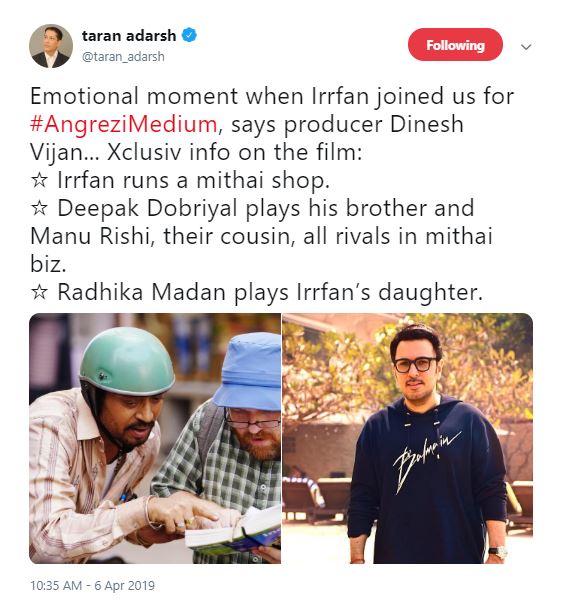 “Emotional moment when Irrfan joined us for #AngreziMedium, says producer Dinesh Vijan... Xclusiv info on the film: ☆ Irrfan runs a mithai shop. ☆ Deepak Dobriyal plays his brother and Manu Rishi, their cousin, all rivals in mithai biz. ☆ Radhika Madan plays Irrfan’s daughter.”