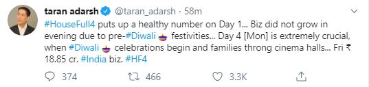 "#HouseFull4 puts up a healthy number on Day 1... Biz did not grow in evening due to pre-#Diwali festivities... Day 4 [Mon] is extremely crucial, when #Diwali celebrations begin and families throng cinema halls... Fri Rs 18.85 cr. #India biz. #HF4"
