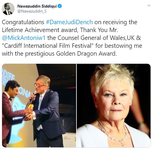 "Thank You Mr. Mick Antoniw, the Counsel General of Wales, UK & "Cardiff International Film Festival" for bestowing me with the prestigious Golden Dragon Award," Nawaz tweeted.