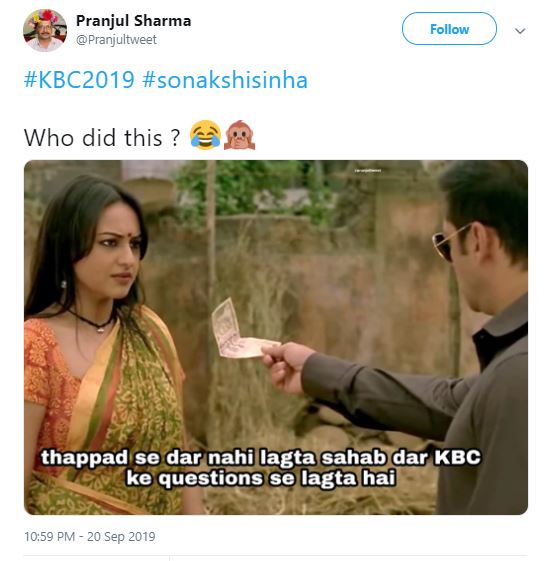 One of the users shared a hilarious still from 'Dabangg' featuring Sonakshi and Salman Khan and wrote, "Thappad se dar nahi lagta sahab dar KBC ke questions se lagta hai."