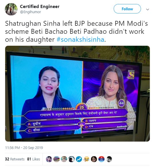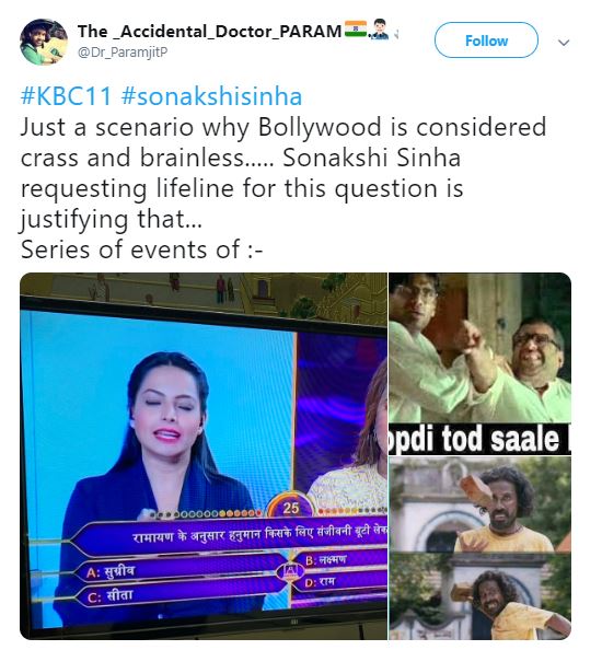During the show, Sonakshi was asked, "According to Ramayana, Hanuman fetched the Sanjeevani buti (herb) for whom?" She got confused between four options given to her in the game - Sugriva, Lakshmana, Sita and Rama.