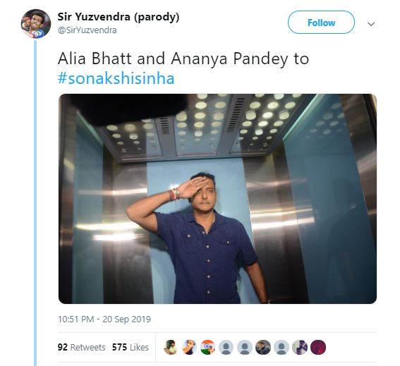 In another hilarious tweet, a user shared a picture of a man saluting which will leave you in splits. "Alia Bhatt and Ananya Pandey to #sonakshisinha," he tweeted.