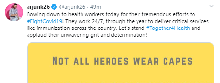 "Bowing down to health workers today for their tremendous efforts to #FightCovid19! They work 24/7, through the year to deliver critical services like immunization across the country," he tweeted.