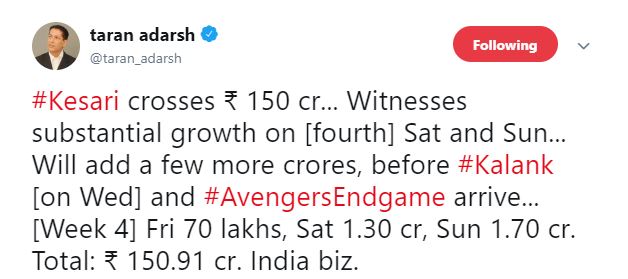 “#Kesari crosses ₹ 150 cr... Witnesses substantial growth on [fourth] Sat and Sun... Will add a few more crores, before #Kalank [on Wed] and #AvengersEndgame arrive... [Week 4] Fri 70 lakhs, Sat 1.30 cr, Sun 1.70 cr. Total: ₹ 150.91 cr. India biz,” he wrote.