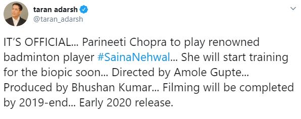 He wrote, “IT’S OFFICIAL... Parineeti Chopra to play renowned badminton player #SainaNehwal... She will start training for the biopic soon... Directed by Amole Gupte... Produced by Bhushan Kumar... Filming will be completed by 2019-end... Early 2020 release.”