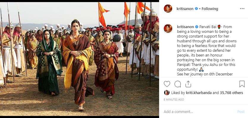 Thanking the man who gave her this opportunity -- Ashutosh Gowariker, she went to extend a word of thanks to the film's director writing: "It's been an honour portraying her on the big screen in Panipat! Thank you Ashu sir for this opportunity!"