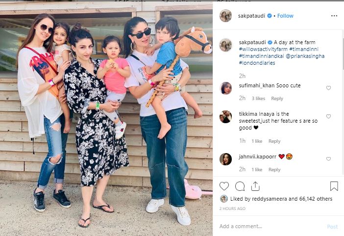 Soha shared a picture where the three ladies including her sister-in-law Kareena Kapoor Khan and reality show host Rannvijay Singha's wife Prianka holding their children Taimur, Inaaya and Kainaat Singh, respectively.