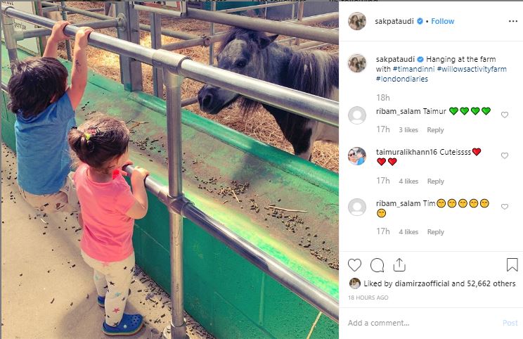 The actor on giving a sneak peek of their fun time at the Willows Activity farm also shared a picture where Tim (Taimur) and Inni (Inaaya) are seen having a gala time as they are curiously seen looking at a pony.
