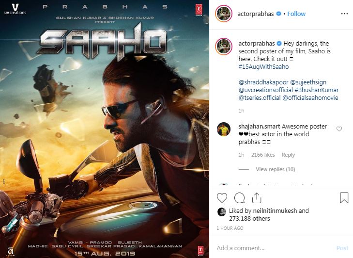 The 'Baahubali' actor shared the latest poster of his upcoming movie and wrote, " Hey darlings, the second poster of my film, Saaho is here. Check it out! #15AugWithSaaho"