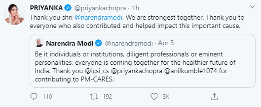 This comes two days after Prime Minister Narendra Modi lauded her and tweeted, "Be it individuals or institutions, diligent professionals or eminent personalities, everyone is coming together for the healthier future of India. Thank you @icsi_cs @priyankachopra @anilkumble1074 for contributing to PM-CARES."