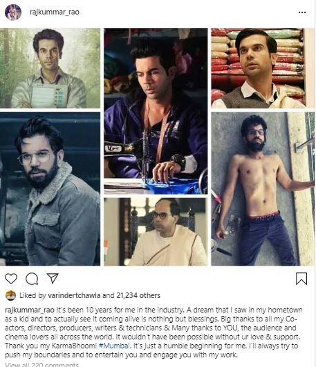 He captioned the post as "It's been 10 years for me in the industry. A dream that I saw in my hometown as a kid and to actually see it coming alive is nothing but blessings. Big thanks to all my Co-actors, directors, producers, writers & technicians & Many thanks to YOU, the audience and cinema lovers all across the world. It wouldn't have been possible without ur love & support. Thank you my KarmaBhoomi #Mumbai. It's just a humble beginning for me. I'll always try to push my boundaries and to entertain you and engage you with my work."