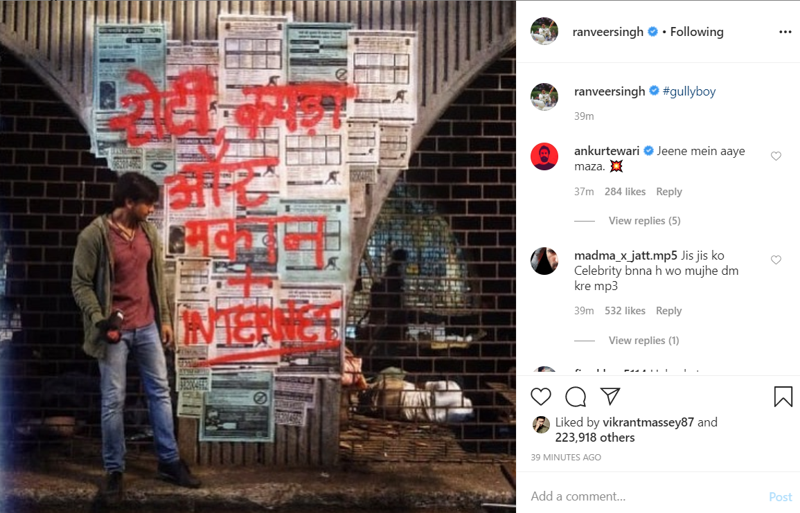 The 34-year-old actor took a trip down the memory lane and hopped on to Instagram to share a picture from one of his acclaimed films 'Gully Boy'.