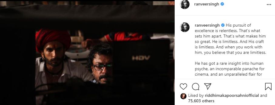 "My bond with SLB is very deep. I have done my best work with Him. He is a master of his craft and a true artist. Whenever you are directed by him you have a tremendous growth spurt as a performer. He challenges you, he pushes you to deliver a performance that's visceral, spirited, and comes from a place deep within you. He enriches and inspires you. He nurtures his actors and extracts their very best performances," Ranveer wrote.