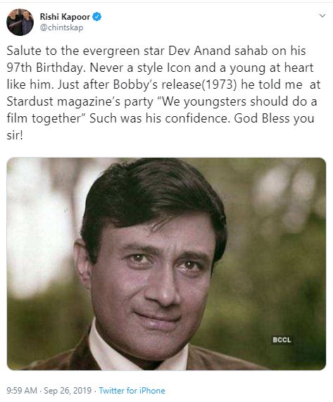 "Salute to the evergreen star Dev Anand Sahab on his 97th Birthday. Never a style Icon and a young at heart like him. Just after Bobby's release (1973) he told me at Stardust magazine's party "We youngsters should do a film together" Such was his confidence. God Bless you sir!" he tweeted.